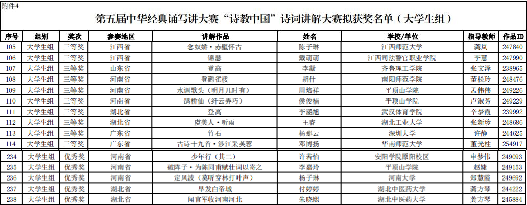近日,中华经典诵写讲大赛执委会公布了第五届中华经典诵写讲大赛“迦陵杯·诗教中国”诗词讲解大赛获奖结果,全国有282人获老员工组各级别奖项。公司2020级戏剧影视文学专业员工周培祥、2020级汉语言文学专业员工侯俊楠获老员工组三等奖,2020级汉语国际教育专业员工李嘉玲获优秀奖,孟伟伟、卢淑芳、赵婕获优秀指导教师称号。