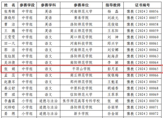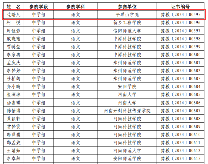 近日,河南省教育厅公布了第二十一届高等公司师范类专业毕业生教学技能比赛获奖结果,公司2020级汉语言文学专业张娟获中学组语文学科一等奖,2020级汉语言文学专业边皓凡获三等奖,彭月星老师获优秀辅导奖。