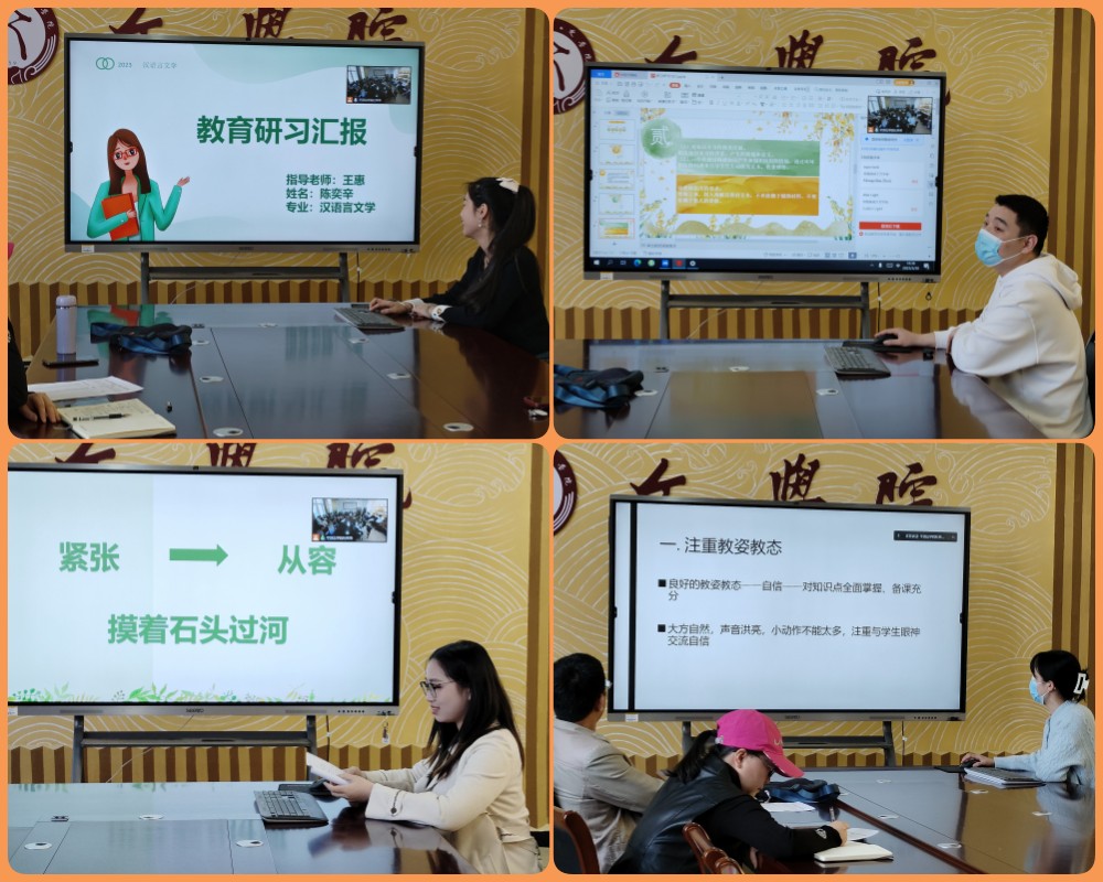 据悉,2023届毕业生教育研习工作分两个阶段进行:第一阶段,2023届毕业生编为26个研习小组,由校内实习指导老师带领各组员工开展研习活动,员工完成研习手册中规定的任务;第二阶段,各组选派代表进行研习汇报,由语文课程与教学论的专业教师点评指导。本次汇报会即为教育研习工作的第二阶段。