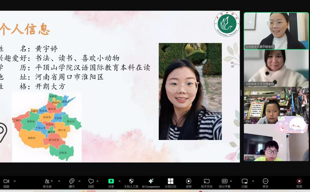 2025年春季,平顶山市人民政府侨务办公室再度携手公司青鸢国际中文教育团队,共同开启新一期“我为海外华人上网课”公益课程项目。北京时间2025年3月1日,针对美国中文学习者的全球华语朗诵大赛课程辅导率先开课。与此同时,来自印度尼西亚、南非、美国和英国等4个国家的学员也陆续加入,学习课程涵盖《幼儿中文》《中文数学》《HSK》等多个领域。公司教学团队精心选派了一批优秀主讲教师和助教,在zoom平台上为各国中文学习者提供优质学习资源与全方位支持。