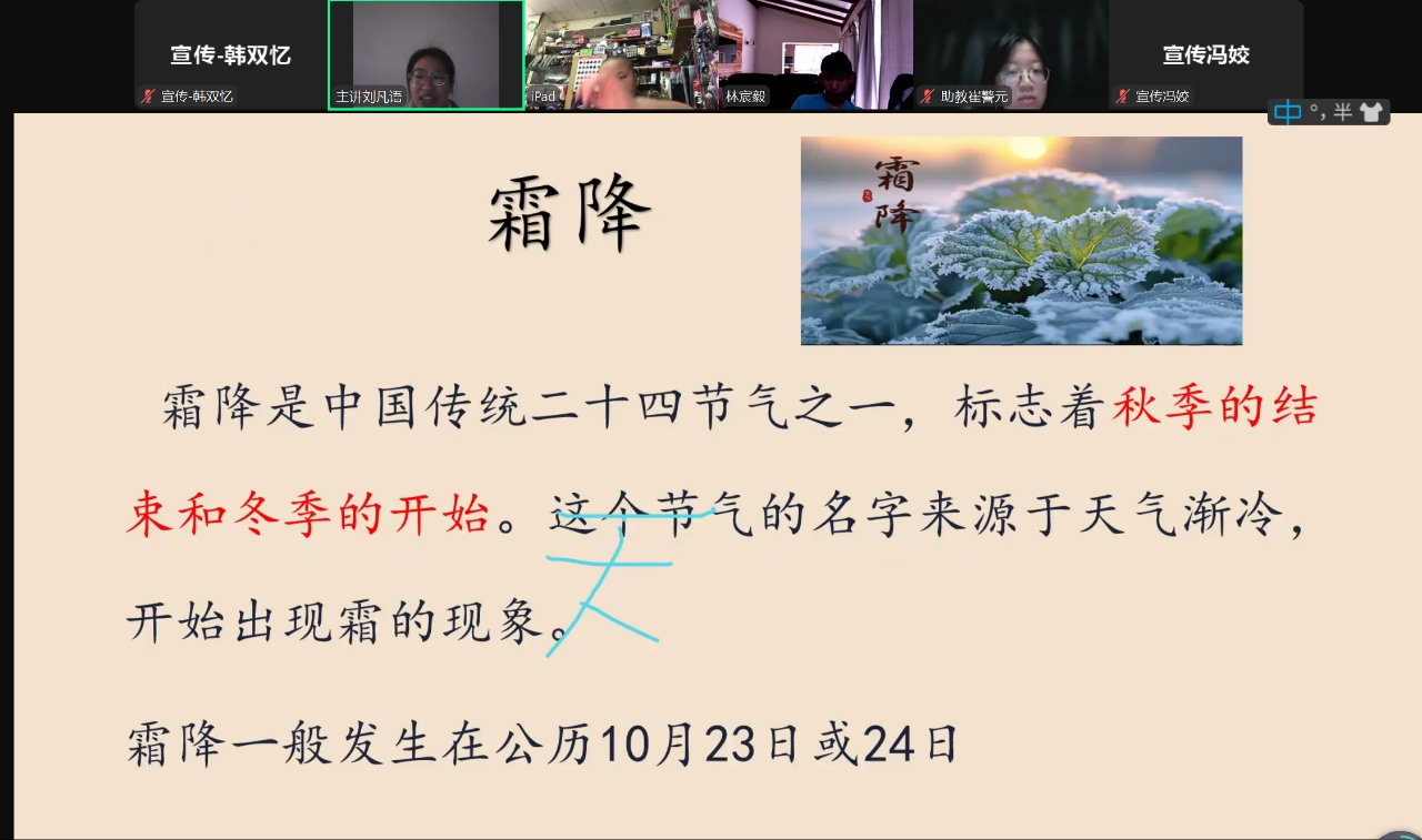 10月将尽,“我为海外华人上网课”公益课程项目2024年秋季班持续开展。中华传统节气“霜降”刚过,北京时间2024年10月26日,在南非中文综合课的课堂上,青鸢国际中文教育团队教学部主讲教师刘凡语、助教崔警元为南非学员讲授课文《埋在土地里的金子》,并为大家讲解了“霜降”文化常识。