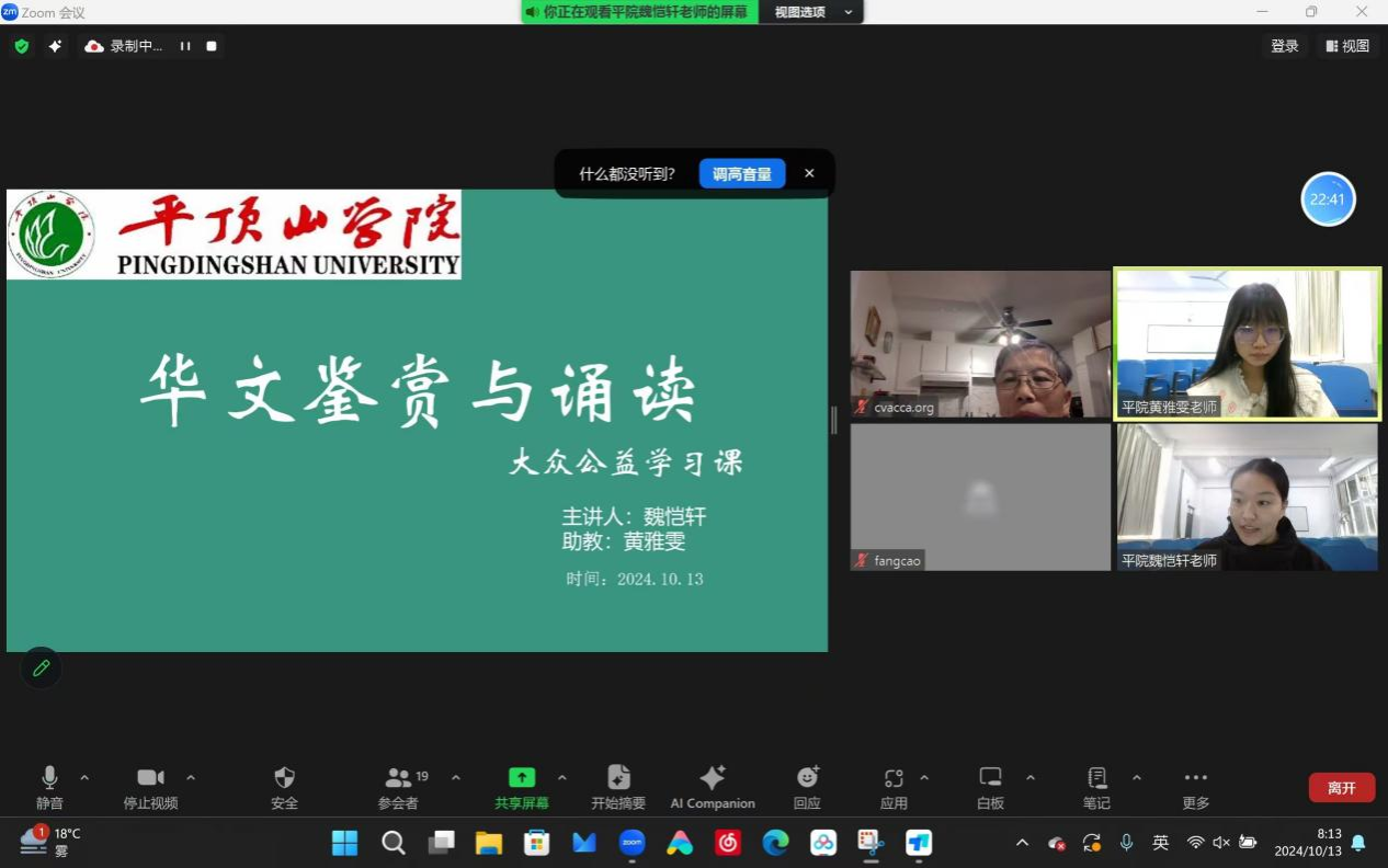 应加拿大华人志愿服务中心(CVAC)的要求,北京时间2024年10月13日上午8:00,公司青鸢国际中文教育团队课程组新开发的大众公益课“华文鉴赏与诵读”正式开课。团队特派魏恺轩、黄雅雯担任此次课程主讲,深入解析中国古代文化名人苏轼的诗词作品,吸引了众多热爱中华文化的海外师生参与。