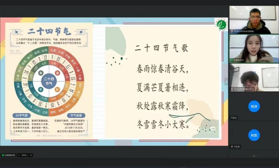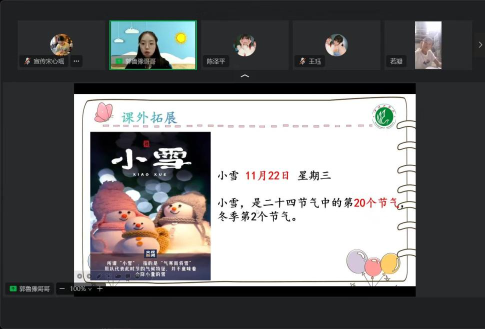 丰年寒酥至,幽韵入人间。北京时间2023年11月20日至26日,2023年秋季线上“我为海外华人上网课”志愿服务项目持续开展,正值中国传统节气小雪,主讲教师将有关小雪节气的文化知识融入教学,为来自美国、英国、印度尼西亚、南非等国的学员传递中华文化的声音。