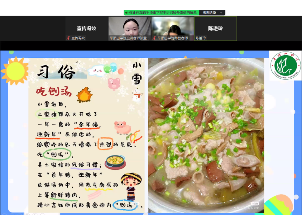 小雪到,冬始俏,气寒将雪,万物冬藏。伴随着冷空气入侵,我国多地呈现出“荷尽已无擎雨盖,菊残犹有傲霜枝”的初冬景象,“我为海外华人上网课”项目的主讲教师向海外学员拓展了小雪节气的形成原因。俗语云:“小雪腌菜,大雪腌肉。”主讲教师采用图文并茂的方式向员工介绍了小雪之时南北方各地腌腊肉、晒鱼干、酿酒、吃刨汤等习俗。文化味道浓郁的课程讲授不仅是一场视觉盛宴,也让员工品味传统民俗中蕴含的中国味道,感受了淳朴的东方生活之美。同时,主讲教师带领学员学习了唐代诗人白居易的名作《问刘十九》,学员们齐声诵读诗篇,细细品味字里行间流露的喜悦氛围与朋友间的深厚情谊,在诗词中感受人间温暖。“云暗初成霰点微,旋闻簌簌洒窗扉。”在此初冬之时,天地于寒凉之间,海内外华人于云端交流学习,天寒人暖,文化传承生生不息。
