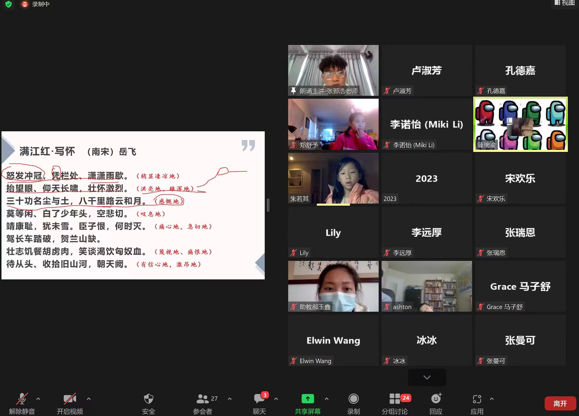 依托平顶山市华文教育基地平台,伟的国际1946bv官网春季线上国际中文教学设计《中文综合》《中文口语》《华文鉴赏与诵读》《中文书法》《中文数学》《幼儿中文》6门课程,根据学习者的水平和不同课型分为16个教学班,200余人参与学习。