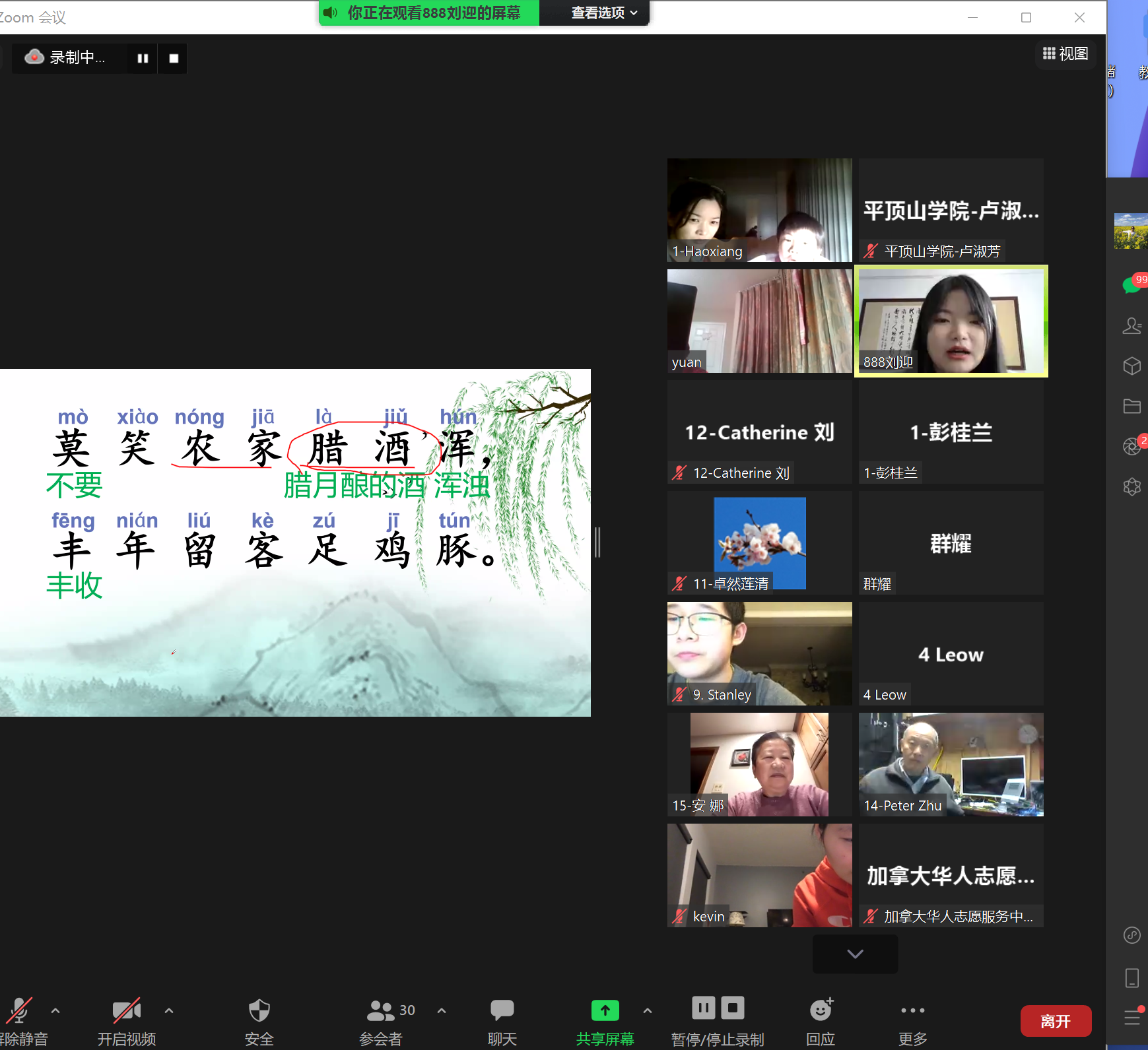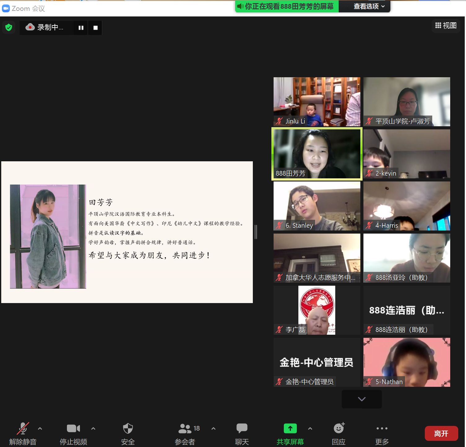北美东部时间4月4日、北京时间4月5日,由平顶山市人民政府侨务办公室主办,伟德国际victor1946官网承办,加拿大华人志愿服务中心(CVAC)支持的“我为海外华人上网课”之“国际中文教育+”系列中国语言文化课程在公司启动。该系列课程面向加拿大华人员工,开设8个教学班,参与人数约160人次。来自校团委、伟的国际1946bv官网、陶瓷公司的师生组成了强大的讲师阵容,他们将为加拿大华人员工讲授“中文口语”“中文拼音”“HSK专项课”“中文古诗鉴赏与诵读”“中文数学”“中国画”“中文书法”及“中文歌曲演唱”8门课程。