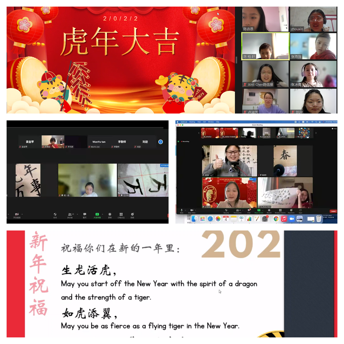 在“中文书法训练课”上,主讲教师展示了用毛笔书写的春联和“福”“虎”“年年有余”“万事如意”“虎年大吉”等书法作品。主讲教师介绍说,贴春联是中国人过春节必备的一项节日习俗。春联上下两句,对仗工整,平仄和谐,内容丰富,用语巧妙,以简洁精巧的文字寄托人们对美好生活的向往。“福”字稳重端庄,寓意家庭富裕、生活幸福,而“虎”字代表着威风、正义和勇敢。中文里有谐音双关的修辞用法,而“年年有余”恰恰是最好的诠释,中国人过年的餐桌上“有鱼”,谐音年年生活“有余”。课程结束时,主讲教师祝愿云端上的外国员工如同中国人民一样,在新的一年里生龙活虎,如虎添翼。