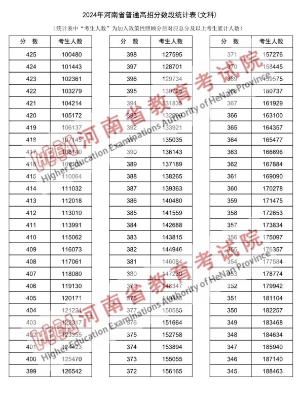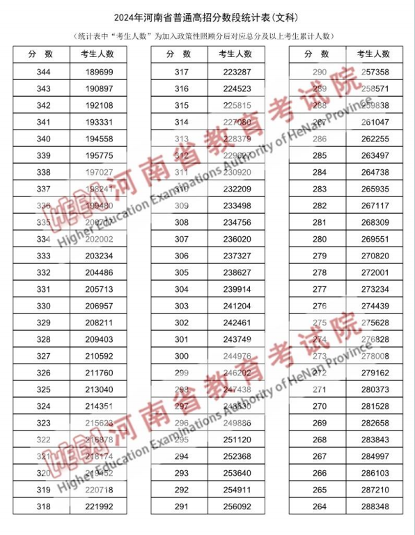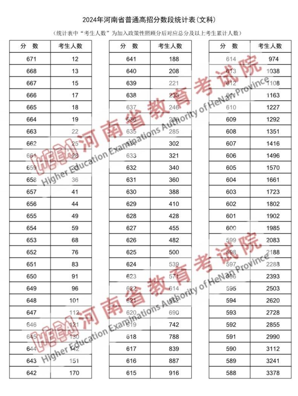 2024年河南省普通高招分数段统计表(文科,部分)