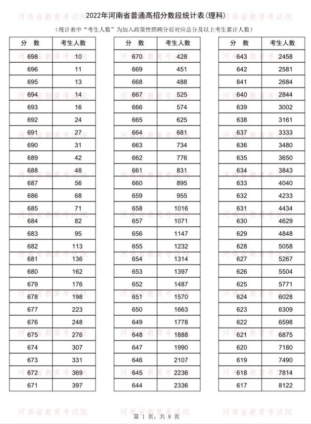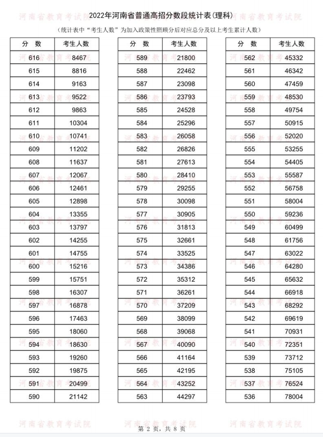 2022年河南省普通高招分数段统计表(理科,完整统计请在附件中下载)