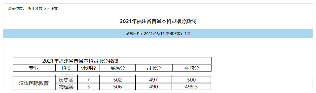 2021年福建省普通本科录取分数线