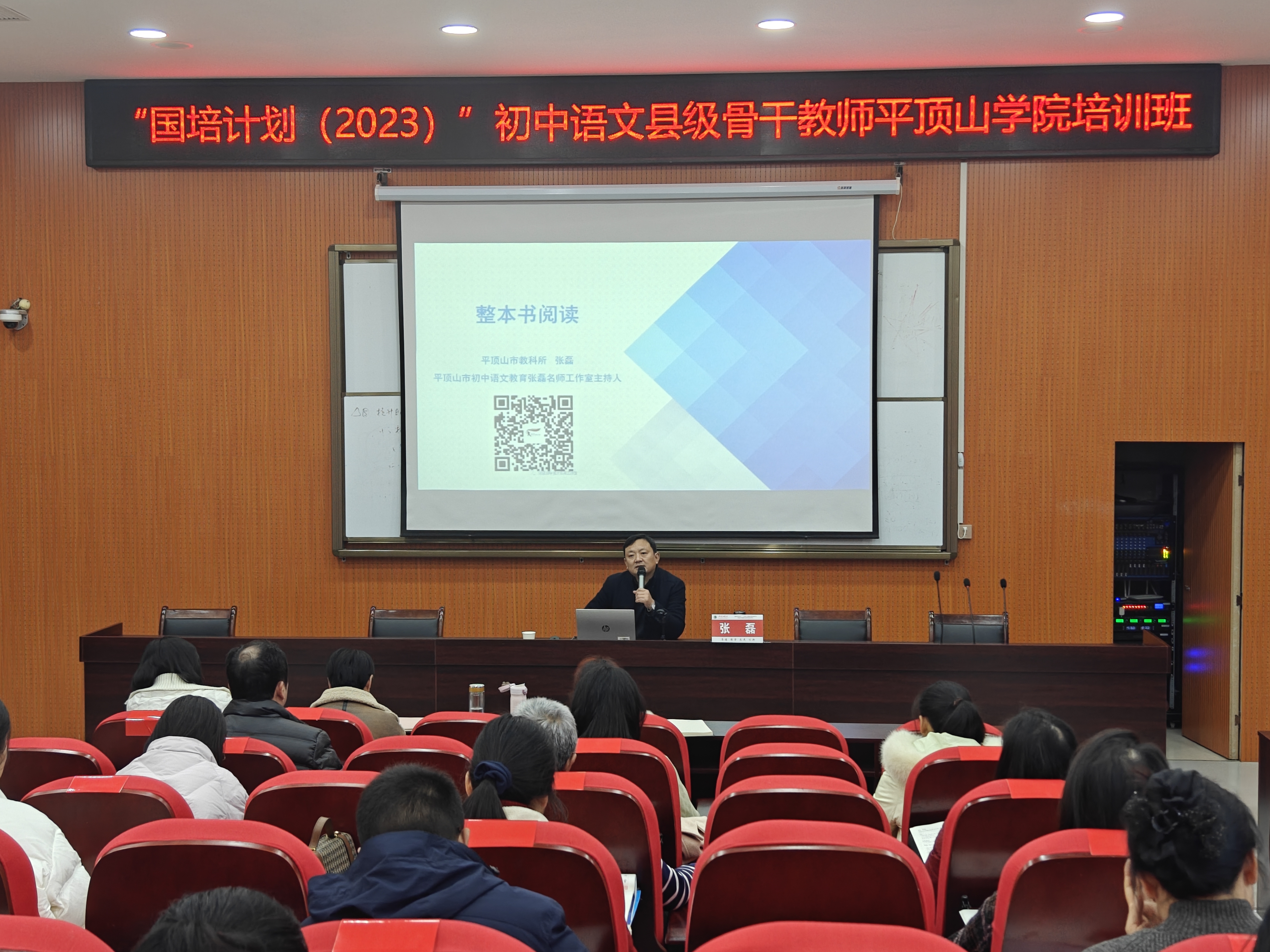 12月8日上午,平顶山市教体局教育科学研究所研究员张磊老师为“国培计划2023”培训班学员作题为《初中语文整本书阅读策略》的专题报告。培训班学员50人参加。