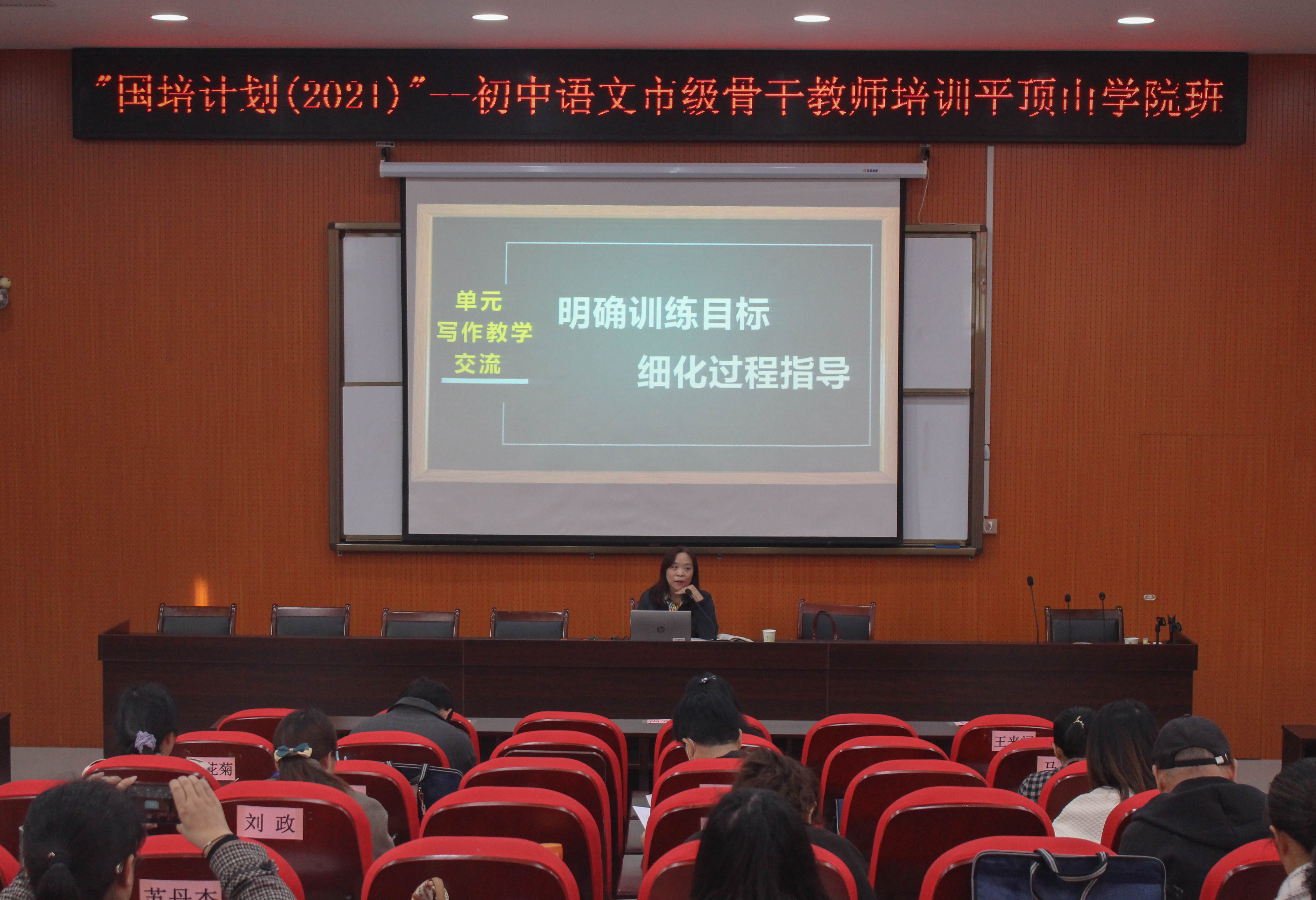 10月21日上午,河南省教学名师、平顶山市优秀教师陈稳信为国培计划(2021)初中语文市级骨干教师培训班学员作了一场题为《明确训练目标,细化过程指导》的初中语文写作教学讲座。全体学员参加了讲座。讲座由培训班课程班主任杜彬彬主持。
